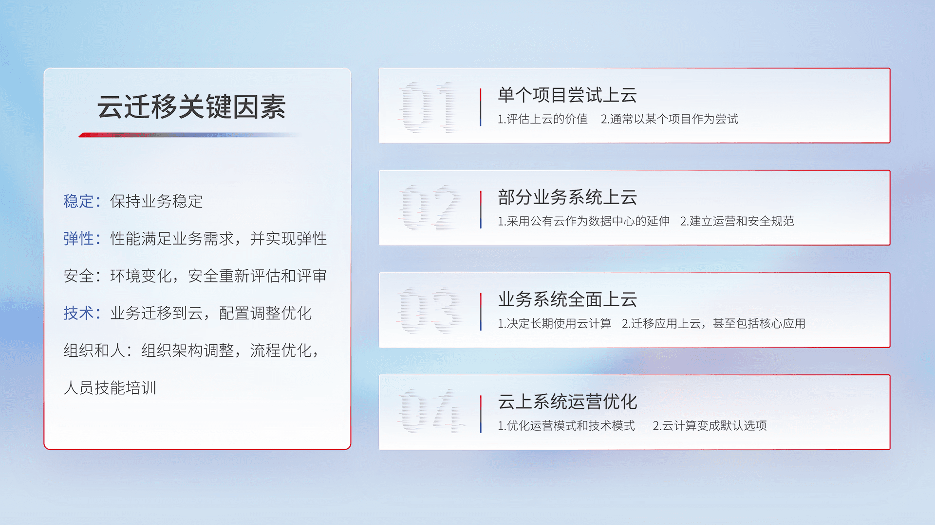 结合实际业务,,,从规划设计、、云平台选型、、云原生改造、、、、数据迁移、、、、集成交付,,,,迁移全过程为客户识别最佳上云路径,,,做好风险识别管理,,,设计网络架构、、、身份权限、、、安全审计合规、、、操作审计、、日志审计、、、监控告警策略、、、多站点容灾设计等,,,,对云上基础设施进行整体规划,,,,提升IT治理水平,,,,以满足弹性、、、高可用、、高性能的需求。。